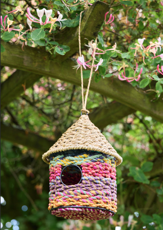 Birdhouse in grass and recycled sari